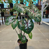 Caladium plant is comprised of a planted bulb, stalks and most important, the heart-shaped leaves. The leaves themselves are the colourful part of the plant. No need to wait for flowers or fruit, a caladium begins to show off its brilliant display as the leaves unfurl.