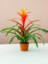 Guzmania is a tropical plant that belongs to the bromeliad family. It is a popular houseplant due to its attractive foliage and vibrant flowers. The plant typically grows to a height of 40-50cm and has a rosette of long, narrow leaves that are arranged in a spiral pattern. The leaves are usually green, but some varieties have variegated or striped patterns.