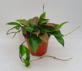 The vines of these attractive, colourful plants can grow up to eight feet long, so growing them in a hanging basket is a way good way to display their waxy, trailing foliage and give them space. They can also be grown in a pot placed on a table or plant stand. A terra cotta pot will usually provide the best drainage. The colourful blooms vary from white to creamy white to pale pink, with the pink color most commonly seen with more exposure to sunlight. More sun also brings out the reddish color of the foliage.