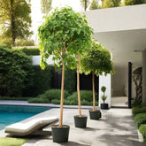 The Sacred Fig, also known as Ficus Religiosa, is a species of fig tree that is considered sacred in many cultures and religions. It is native to the Indian subcontinent and can grow up to 30 meters tall, but the variety available for purchase typically grows between 2.2 and 4 meters. The tree has a distinctive appearance with a thick, grey trunk and large, heart-shaped leaves that are a glossy green color. The leaves are about 10-17 cm long and have a pointed tip. The tree produces small, greenish-yellow flowers that are not particularly showy, but they are followed by small, round figs that are about 1-2 cm in diameter.